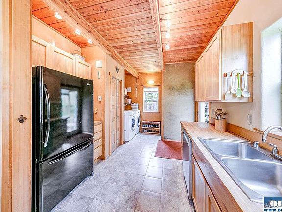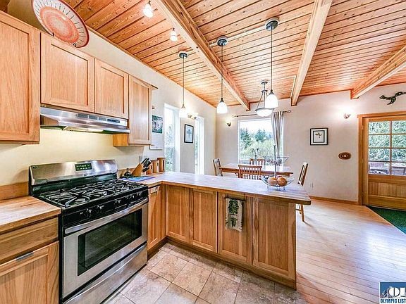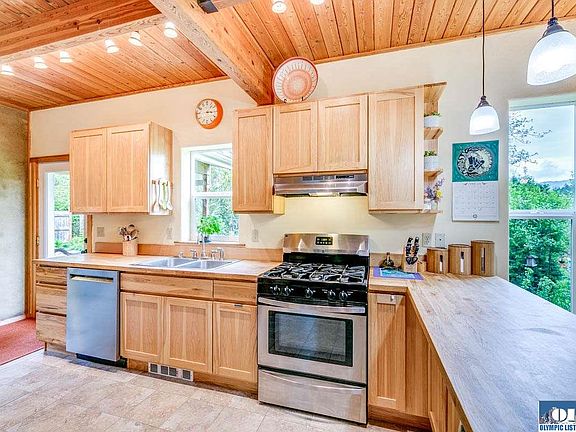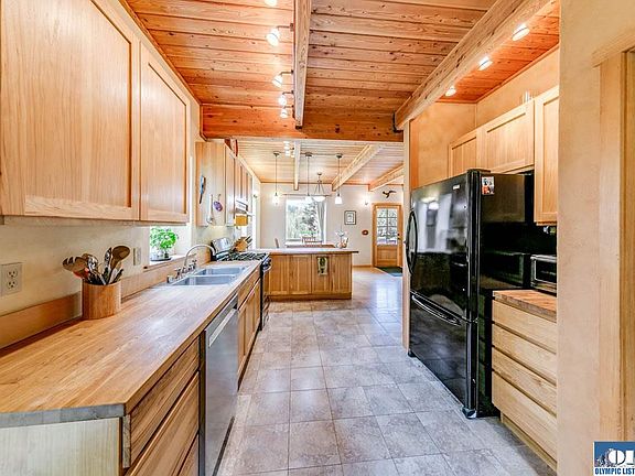 Amazing home located on the Olympic Discovery Trail west of Port Angeles close to Salt Creek. Rare south-facing property with exceptional mountain views provides abundant light! Open concept kitchen & dining allows for visiting in the kitchen & living areas while enjoying the peaceful views. Cozy wood burning stove with adobe brick wall for thermal heating. Outside is a haven of natural beauty with native & ornamental landscaping, fruit trees & shrubs, garden beds, chicken run & outbuildings.