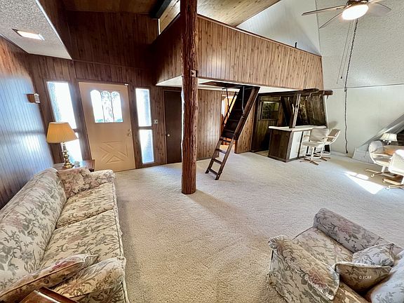 This spacious home features a cozy fireplace and a wet bar - perfect for entertaining guest or family. A pullout ladder leads to a charming loft area, providing additional space. The kitchen boasts brick accents, exposed beams, and a gas stove that adds a touch of rustic charm. The kitchen pantry offers ample storage with shelves and drawers, while the island has a convenient pot rack above. Hosting barbecues is a breeze with the built-in gas grill, and the sunroom creates a delightful space to savor meals or indulge in a morning coffee. The laundry room features a utility sink and is adjacent to the attached shop/craft area. The second bedroom has an attached bathroom and a built-in vanity. The master bedroom boasts double closets and a spacious en-suite bathroom featuring a walk-in shower. The outdoor spaces are a true delight. The gated driveway ensures security and seclusion, while the large garage with shelving offers ample storage. The beautiful landscaping includes a pond adorned with tiger lilies, a lush lawn with automatic sprinklers, mature trees, lilac bushes, and a delightful patio for outdoor enjoyment. The home also has a shed, wood storage, and a well house.