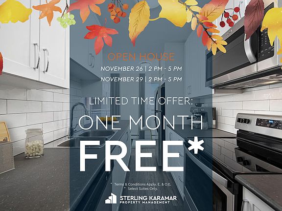 - Special offer! Limited Time Offer | Enjoy 1 Month FREE on a 13-Month Lease!* (Select Suites) - Limited Time Offer | Enjoy 1 Month FREE on a 13-Month Lease!* (Select Suites) *Terms & Conditions Apply.