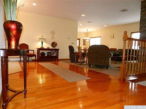 Built in 2004. Many extras and loving attention during the build. Double-pane Andersen windows, well insulated, efficient. Extra-thick asphalt circular driveway. Spring-fed well has never run dry even with frequent garden watering. External generator port and switch box for off-grid operation during emergencies. Propane fireplace heats great room quickly in winter. Radiant baseboard heat. Central A/C. Wood floors. Laundry room. Theater room. Finished basement with entertainment center, bar, refrigerator and pool table. Separate walk-out garage in back for garden tractor or ATV. Mature apple trees, blueberry bushes, red raspberries, wild blackcaps, and vegetable gardens. 16' deep, Spring-fed largemouth bass pond. Quiet property bordered by a 600ac farm to the East and 450ac in land conservancy to the North and West.
