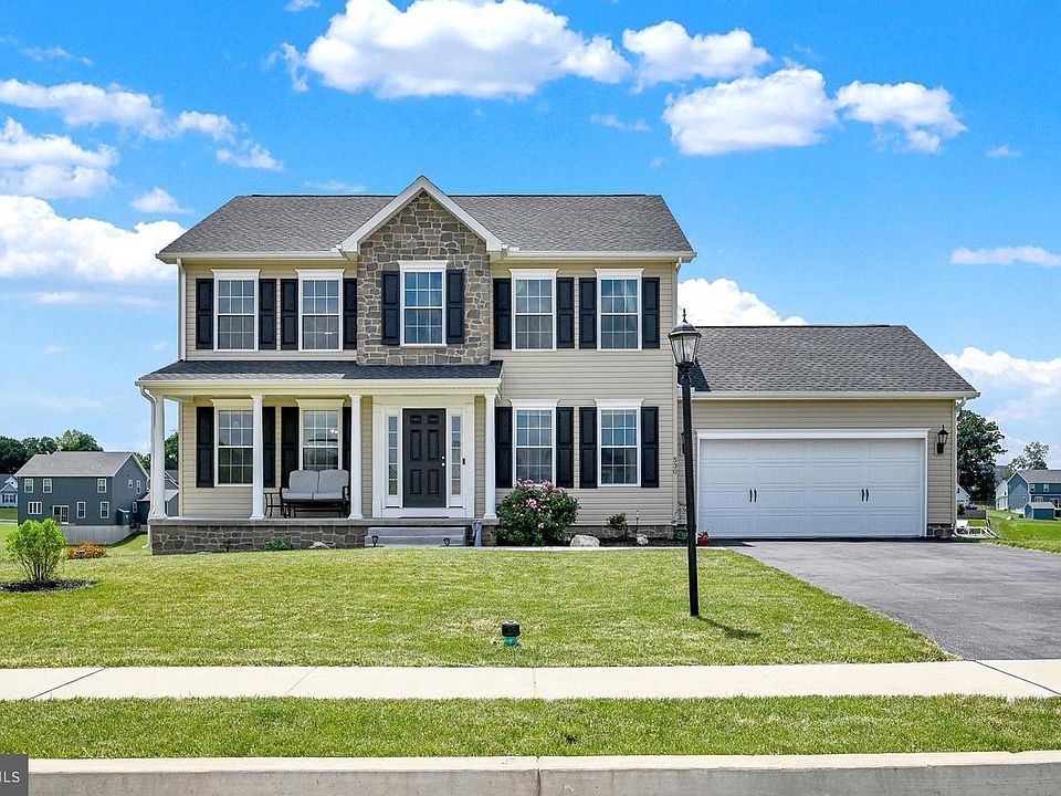 Nestled in the desirable Stonewicke Community of South Hanover, PA, 530 Ripple Drive is a beautifully designed Colonial-style home that exudes charm and modern sophistication. Built in 2022 and meticulously maintained, this home features a striking stone-front exterior, a covered front porch, and elegant architectural details that create timeless curb appeal. Step inside to a bright and welcoming foyer, situated between a formal dining room and a formal living room, ideal for hosting gatherings or enjoying quiet moments. The center of the home, the well-appointed kitchen, boasts stainless-steel appliances, granite countertops, and a spacious island with bar seating—perfect for casual meals and conversation. The open-concept design flows seamlessly into the expansive family room, providing a warm and inviting space for relaxation. A pantry and a convenient half bath complete the main level. Upstairs, you'll find four generously sized bedrooms, including a luxurious primary suite with cathedral ceilings, a spa-like en-suite bath with dual sinks, dual shower heads, a jetted tub, and an impressive walk-in closet. An additional full bathroom serves the remaining bedrooms, while a second-floor laundry room adds convenience to your daily routine. Step outside onto the low-maintenance Trex deck, where you can take in the scenic backyard—an ideal space for outdoor entertaining or quiet relaxation. The spacious two-car garage provides ample storage, and the walk-out basement with a bathroom rough-in offers endless possibilities for future expansion. Plus, original builder warranties are still active and transferable! Don't miss this incredible opportunity to own a like-new home in a fantastic community! Schedule your private showing today!