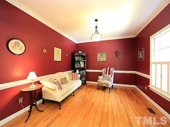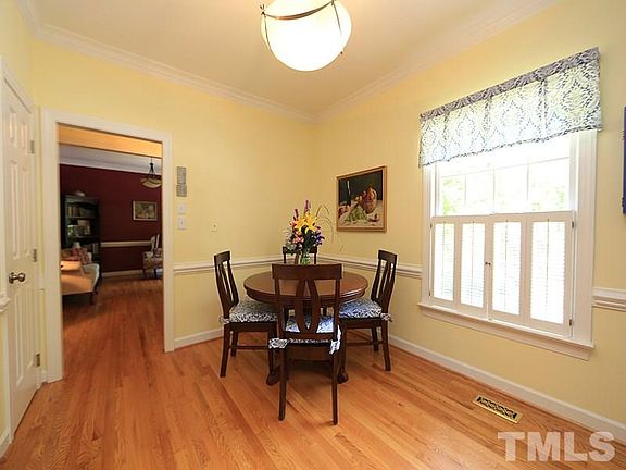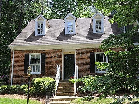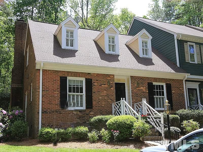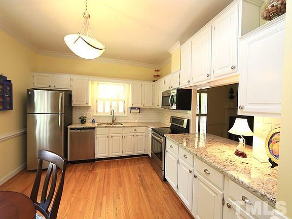 Adorable 1st floor master end unit town home! Huge living room, large formal dining room, real hardwoods entire first floor, Granite counters updated kitchen with S/S appliances and subway tile back-splash, wood burning FP. Fully updated bathrooms. Private wooded views from wonderful screened porch with closets, outside storage area. Interior shutters, two very large walk-in- closets with custom shelving off 2nd floor large bedrooms.Property backs to Ravenscroft . Great North Raleigh spot! Hurry!!