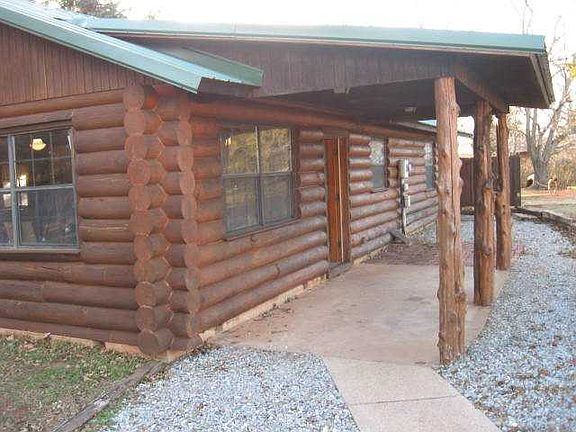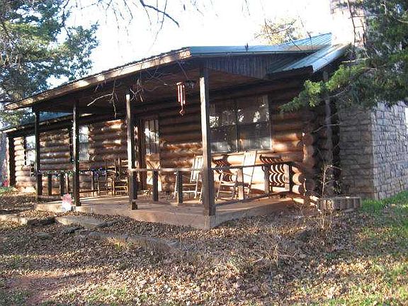 A REAL LOG HOME !! Awesome wood cathedral ceilings, vaulted over the living, dining, & kitchen areas. Great stone fireplace highlighted with log mantle. Oak laminate flooring. New kitchen countertop, sink, & faucet. Two covered porches to enjoy treed acreage. Metal roof on house & garage & R.V. Parking.