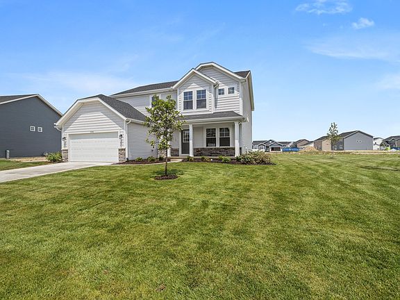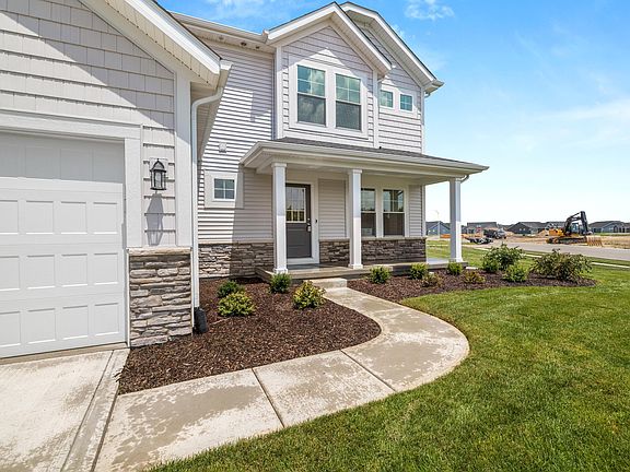The Sedona, an open concept floor plan on the main floor that combines the living area with 20 ft ceilings, eat in kitchen and dining - ideal for entertaining. The kitchen features blue cabinets with quartz countertops, stainless appliances, large island and spacious walk-in pantry. A beautiful oak railing staircase leads upstairs. The primary bedroom has French doors, a tile shower, double bowl vanity and large walk-in closet. Full basement with rough in plumb. 2 car garage with front and side extension. Front yard landscaping. Patio. All with the Industries Best Customer Care Program and Warranty! This home is not complete or had quality control inspections. It will be complete 6/30/25.
