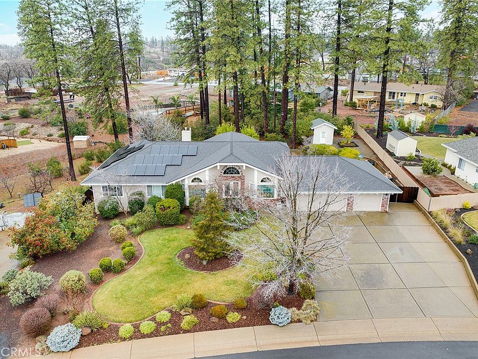 This home offers all the beautiful luxuries you would expect from a quality home in one of Paradise most desirable, established, upscale neighborhoods. OWNED SOLAR and an automatic back-up GENEARATOR are just two of the modern luxuries that make this home stand above. When you step in you will immediately be impressed with the craftsmanship and attention to detail including expansive cathedral ceilings with wood beam accents, newer luxury vinyl plank flooring and the beautiful, whitewashed brick fireplace. The spacious kitchen includes a center island, pantry, ALL NEW stainless appliances, 8-foot breakfast bar, garden window and more plus lends itself to the neighboring dining room and kitchen nook. LARGE master suite features a large walk-in closet, access to patio and a master bath offering double vanity, step in shower and a soaking tub. All bedrooms and baths are spacious plus there is a LARGE bonus room with double door entry. Large three car garage (finished with insulated garage doors) provides room for plenty of storage, PLUS beyond the garage there is additional space perfect for a hobby room, workspace or possibly a guest area with a private bath complete with shower. All of this is nestled on a large over half acre parcel with park like landscaping front and back. Room for RV parking, back yard driveway access and a SHED complete this charming home. The upgrades are endless... 2018 OWNED solar system, 2019 Culligan carbon water filtration system, surround sound, 2019 new HVAC, 2019 new ROOF, 2019 new R-38 insulation, new hot water heater 2019, newer 10KW Generac gas automatic start generator system, new kitchen appliances 2020/21, new flooring throughout main living area 2020. Schedule a private showing today....