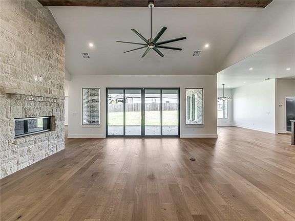 WOW! This one is stunning! This gorgeous home sits on a corner lot. You enter the beautiful front door into the entry way. To the left is an extra large office. The entry way then spills into the huge great rooms with stunning fireplace and kitchen overlooking the living room. The kitchen is gorgeous with stained cabinets and top-of-the-line appliances. The island is extra large with plenty of space and storage. The dining room is also large with a beautiful light fixture. The natural light from the windows and large patio doors makes it extra inviting. The primary suite is a the back of the house with 2 large closets, an en-suite bathroom with large shower & free-standing tub and 2 large vanities. The attached laundry room also goes to the hallway where 2 of the secondary bedrooms are located. The other is located on the opposite side. The secondary bedrooms all have their own large bathrooms. The patio is large with an inviting fireplace and large backyard. This one won't last long!!