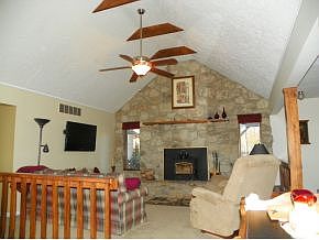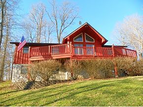 3br, 3ba cedar/stone chalet atop 3.87 ac/with valley views. Large elevated front deck, patio w/ pergola and aerated pond w/dock. Cathedral ceilings highlight stone fireplace w/ insert. Finished basement includes wet bar. Large master suite w/ custom shower. New kitchen w/ all new Amana appliances. City water, paved drive, oversize (26x28) garage, new roof and new AC. Outbuildings include 17x24 2 story pole barn w/ elect and 24x32 wood heated workshop w/ concrete floor and electric.