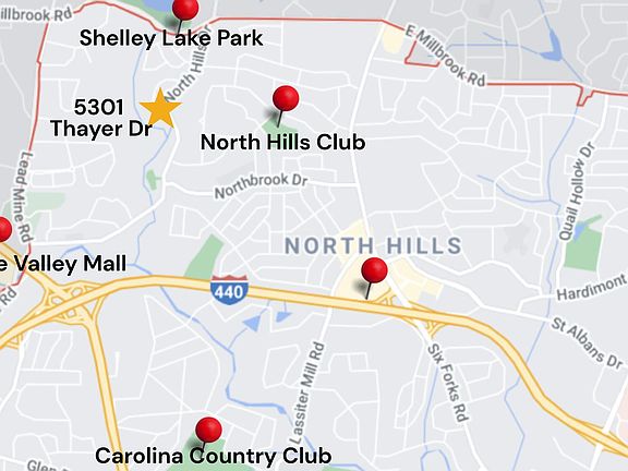 Discover a rare North Hills teardown opportunity on nearly a half-acre corner basement lot that backs to the Mine Creek Greenway. The existing home was built on a slab foundation over unstable fill and has experienced significant structural issues over time; the property is being sold for land value only. Square footage is based on tax records and may not accurately reflect current conditions. Exterior viewings only. Located just 5 minutes from North Hills and 5 minutes from Crabtree Valley Mall, this site offers unmatched convenience to Midtown's top dining, shopping, parks, and magnet school options. Easy access to I-440, Shelley Lake, and the North Hills Club makes this an exceptional setting for those looking to build in a high-demand area. Ideal for custom-home clients, spec builders, or anyone seeking a build-on-your-lot opportunity in a proven luxury infill corridor. With mature trees, generous frontage, and excellent visibility, 5301 Thayer Drive presents a standout canvas for a future new-construction home with strong long-term value in one of Raleigh's most desirable neighborhoods.