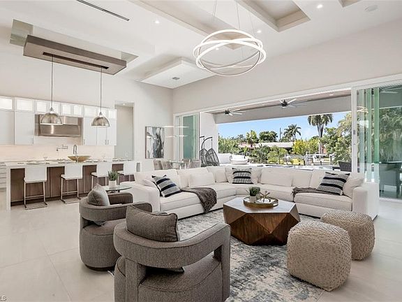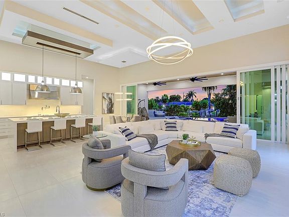 Custom-built residence in the Yacht Club area with DIRECT GULF ACCESS just minutes away from open water. Yacht Club Project is currently underway and situated very near this home. Featuring 3213 square feet of living space with 4 bedrooms, office, 6 baths, wine room, and 3-car garage with impact glass garage doors this property offers everything you need. Meticulously crafted, expertly designed by Lux Development Group showcasing their signature blend of unique design and exceptional attention to detail. Appreciate the beautiful landscaping, porcelain cladded columns, modern lighting, and a floating waterfall walkway entrance. Breathtaking views through 32-foot PGT impact sliding doors that seamlessly blend indoor and outdoor spaces. The 16-foot coffered ceilings elevate the aesthetic of this home to a whole new level. A striking feature wall complete with a TV, LED accent shelving, and a cozy fireplace creates an ambiance that is both warm and welcoming. A gourmet chef's kitchen designed for both beauty and functionality. Custom Shaker-style cabinetry with 60" tall uppers and glass inserts, the hidden walk-in pantry with ample storage for all your culinary needs. A magnificent 10-foot island, a 48" workstation sink, induction cooktop, 48" fridge, along with a dedicated coffee station for your morning rituals. Temperature-controlled glass wine room featuring custom cabinetry and a dedicated de-corking station. Retreat to the opulent master bedroom, a serene sanctuary that offers panoramic waterway views through expansive 135-degree corner sliders. The custom-designed walk-in closet provides a spacious haven for ultimate organization. Indulge in the spa-inspired master bath, featuring floor-to-ceiling tiled walls with a luxurious mother-of-pearl inlay accent. All guest bedrooms boast their own en suite bathrooms, each one featuring a unique and stylish design. Step outside to discover a resort-style outdoor living space that is perfect for entertaining or unwinding. Bathed in desirable Southwest exposure, the expansive area features a private cabana with idyllic canal views, perfect for enjoying tranquil sunsets. The fully-equipped outdoor kitchen features Level 5 granite countertop, composite cabinetry, grill, and beverage cooler. Dive into luxury with the resort-style pool, complete with a sun shelf, invigorating outdoor shower, and an 8-person infinity spa, all enhanced by a mesmerizing cascading waterfall. Pool, spa and waterfall are app-controlled. This home provides exceptional indoor and outdoor experiences. Savor breathtaking sunsets from your poolside cabana while unwinding to the soothing sounds of the waterfall. Enjoy the benefits of a captain's walk, composite dock, 16 lb lift, and boat canopy, all included with this home.