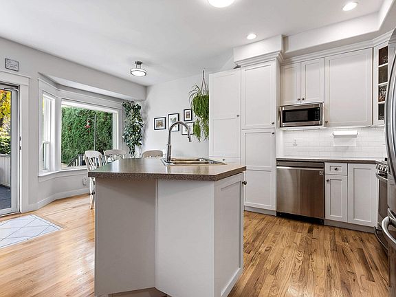 Welcome to this inviting 3-bedroom, 3-bathroom NON-STRATA 1/2 duplex in a prime location! The main level boasts an open-concept design, featuring beautifully refinished HARDWOOD FLOORS & new flooring in the laundry room & powder room. In the kitchen, you'll find UPDATED WHITE CABINETRY, an island w/ storage & new s/s appliances. Upstairs, the primary bedroom features an ENSUITE w/ a new shower & a generous WALK-IN CLOSEST. There are 2 additional bedrooms & a full bathroom down the hall. The basement provides added versatility w/ a generous rec room, AMPLE STORAGE SPACE, & access to the yard. Outside, the PRIVATE, YARD BACKS GREENSPACE & features a LARGE PATIO ideal for entertaining! With a double garage, room for RV PARKING, A/C, & best of all—NO STRATA FEES! Don't miss out!