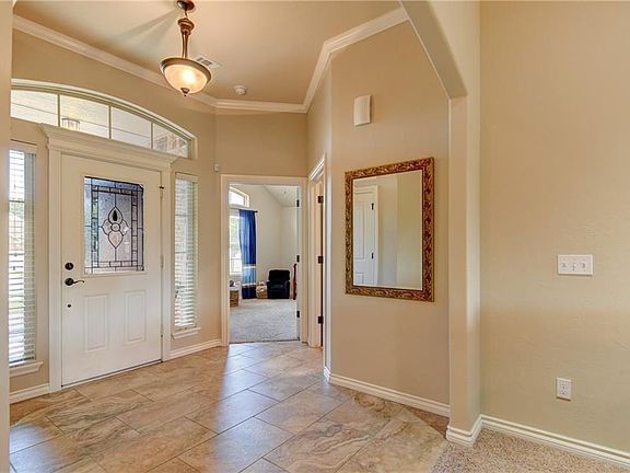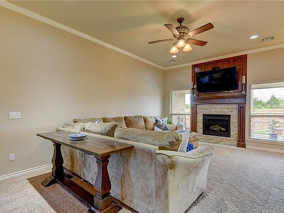 This stunning home has been well maintained! Featuring a beautiful entrance that leads directly into living room with a fireplace and custom woodwork, this home also boasts a kitchen with a breakfast bar, pantry, granite counters, tile backsplash, stainless steel appliances, and under cabinet lighting. Crown molding runs through the living and kitchen. The master oasis includes a tray ceiling, double granite vanities, corner whirlpool tub, extra vanity space, and walk in closet. This home also provides a HUGE backyard with covered patio and storm shelter!