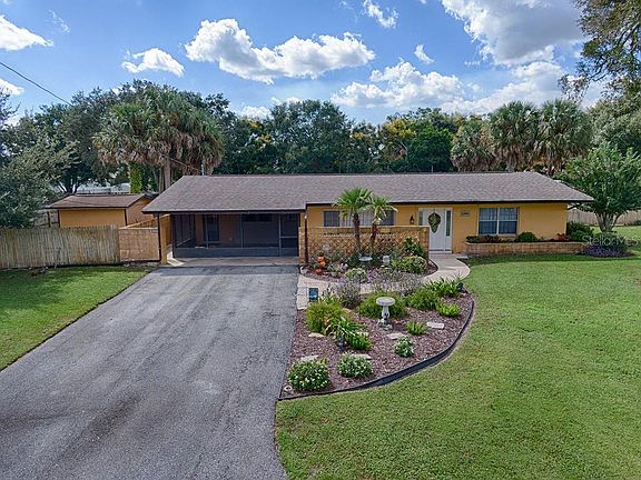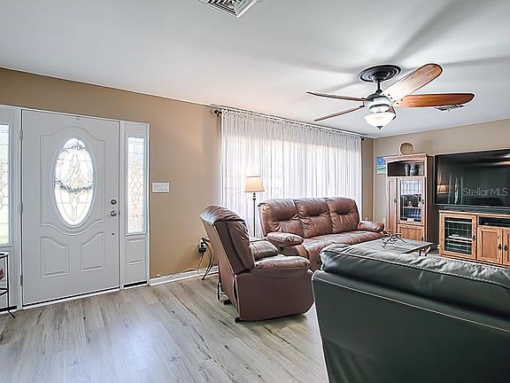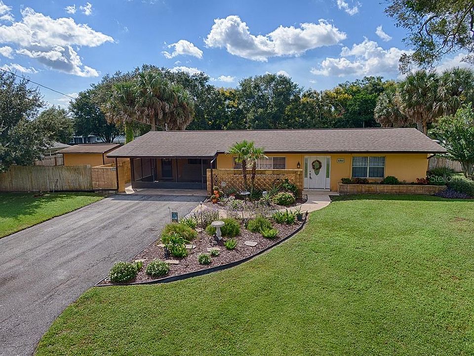 POOL PARTY!! Let the fun begin in this gorgeous pool home! This 3 bedroom, 2 bath home offers a split bedroom plan and upgrades through out it! There is NO CARPET and new Beautiful Neutral Gray, Laminate flooring in most of the home with Ceramic Tile in the Kitchen, Baths and Florida room. Cooking will be a delight in the RENOVATED KITCHEN! The NEW cabinets are gorgeous and are illuminated with under cabinet lighting! They include an abundance of drawer storage and all have soft closure hardware. Upgraded, Stainless Steel Appliances including a French door Refrigerator with Veggie drawer and a Gas Range with DOUBLE OVENS! The Quartz counter tops wrap around the kitchen offering wonderful counter space. Other upgrades include a Newer roof in 2016, Newer HVAC 2017, Pex Plumbing system, Newer Front door and Front Lanai door, Newer Screens on the windows and Newer Outside electrical service and inside Panel! The Hot water heater has also been replaced with a High ENERGY EFFICEINT Water heater. In addition to the 1621 recorded living area there is an additional Florida room with a mini split unit and a huge bonus room perfect for a man cave, office or additional storage. Step out the back door to a enlarged screen enclosure with an amazing Covered Patio Area overlooking a 20 x 40 pool! The pool has been converted to a salt water system for easy maintenance. There is also plenty of back yard in addition to the pool area and it is fenced in with a wood privacy fence. There are two storage buildings which need some TLC but are great for yard tools. The community offers access to a community boat ramp, dock and picnic area for optional HOA memberships with a minimal fee of $55.00 a year! And it is on Lake Griffin which is part of the Harris Chain of Lakes! A pool, an upgraded stunning home and Chain of Lakes access...What more could you want??