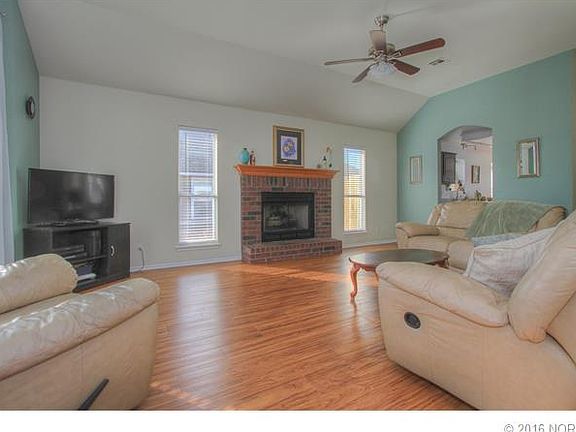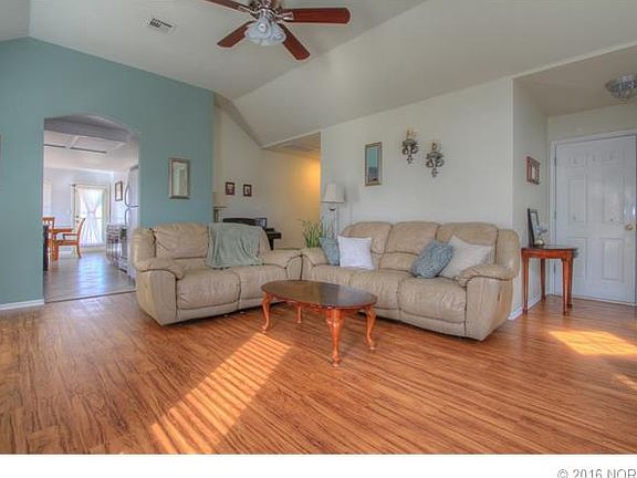Extensive updates! New flooring, vinyl siding, high effic. furnace, newer roof, storm shelter, 3rd garage bay w/pull-through&workspace, vaulted ceilings, floored attic, entertainer 's patio, Turnpike access, near new elem. & early childhood center