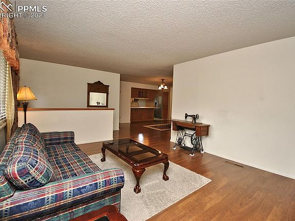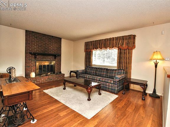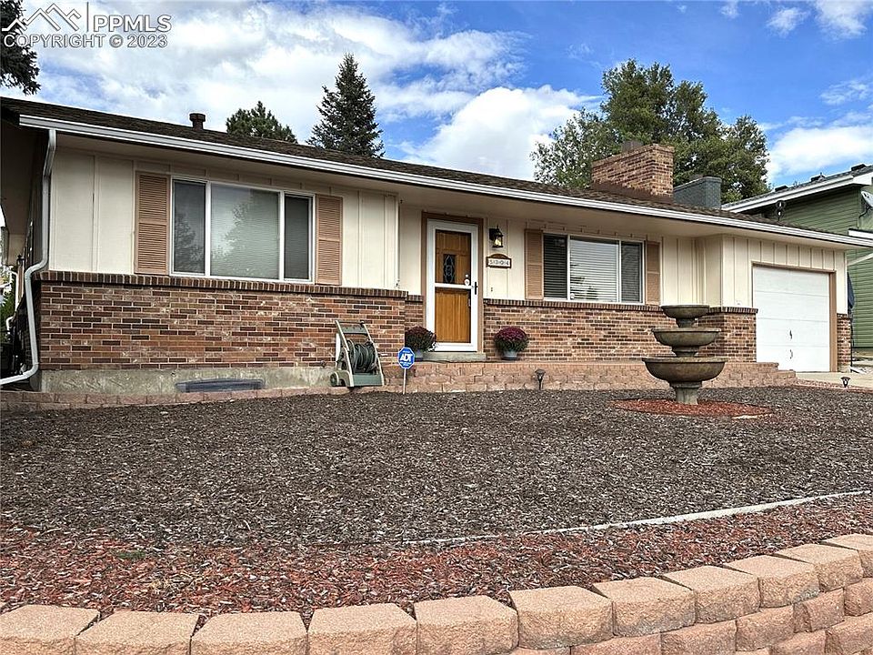 PERFECT RANCHER!! with Perfect location only minutes to Peterson Air Force Base. This cozy ranch style home features main level master suite plus main level open living. Wood type floors grace most of the main level dining, kitchen and living areas and full brick fireplace. Kitchen has real wood cabinets and all the appliances. Spacious bedrooms om both levels plus craft room and storage in the finished basement. New roof and gutter helmets, Big covered patio, gardens and shed plus easy care landscaping. 1 car garage plus plenty of off street parking. Only a couple blocks to the Elementary School.