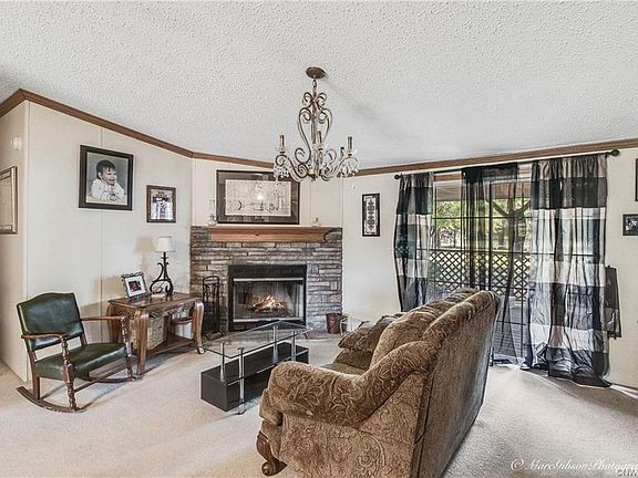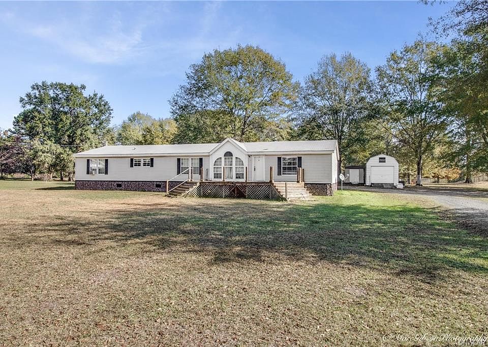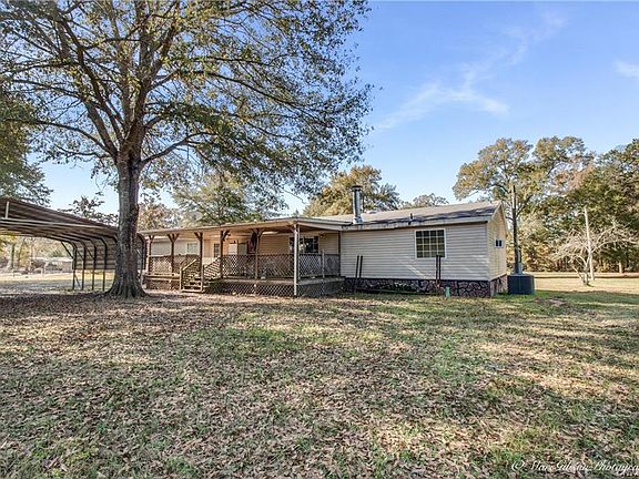 Double wide mobile home nestled on approx. 2.75 acres. Two huge metal carports perfect for boats, side by sides, lawn equipment, etc. Large front/back porch perfect for sitting & enjoying the peacefulness. Very open floor plan, large island with bar seating. Lots of cabinets, stone accent on island. Kitchen overlooks two seating areas, den & living room. Wood burning fireplace in den. Spacious bedrooms. Large master bedroom & bath, dual sinks, walk in closet, built in vanity space. Separate Office.