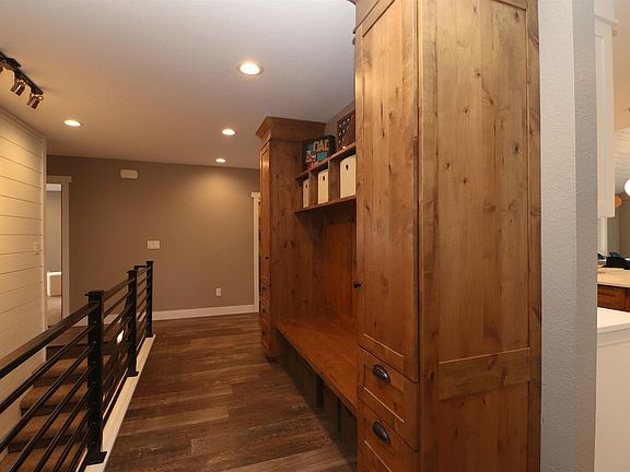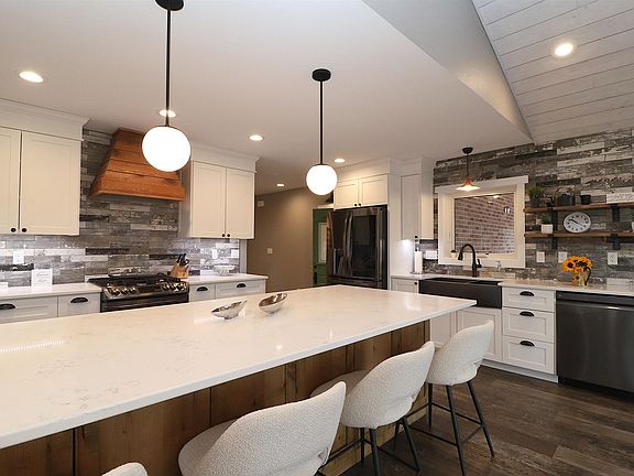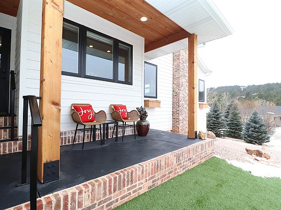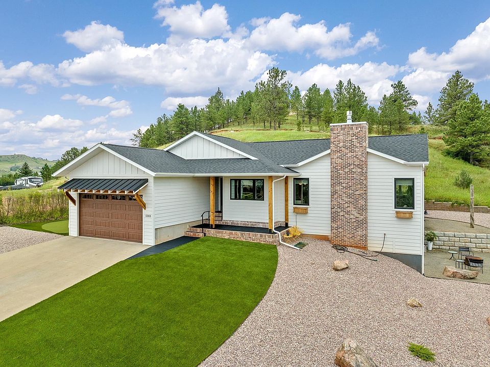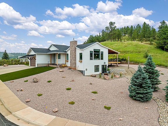 Listed by Suzanne White, 605-390-0137, Keller Williams Realty. The impeccable design of this home is one-of-a-kind! Located in a peaceful cul-de-sac off of Sheridan Lake Road, you'll feel at home with stunning views, warm natural woods, and industrial brick and metal details. The open great room features shiplap vaulted ceiling, large windows, and brick fireplace. The kitchen is a dream with custom cabinets, large quartz island, gas range, and walk-in pantry. Office space just off kitchen can be closed off with barn door. Entertain easily with your spacious back deck with TV hookup. The master bedroom features access to back patio area (wired for a hot tub!), en suite with tiled shower, dual vanity, fantastic storage, and walk-in closet. All bedrooms have custom closet organization. The second upper bedroom includes a built-in desk. The walkout basement features oversized open family room, beautiful laundry room with cabinetry and sink, two more bedrooms, and bathroom. Slatwall system in pantry, bedroom, and garage for storage. Completely renovated in 2018. There is a bonus gun safe room with keypad lock in the basement. There is plenty of space for vehicles with attached 2-car garage and detached oversized garage with RV hookup. Detached garage is plumbed for gas heat. Enjoy the no maintenance rock and turf landscaping, as well as your own putting green! There is an underground dog fence as well! Buyer & buyer agent to verify all MLS data.