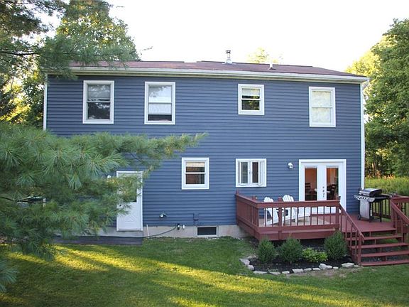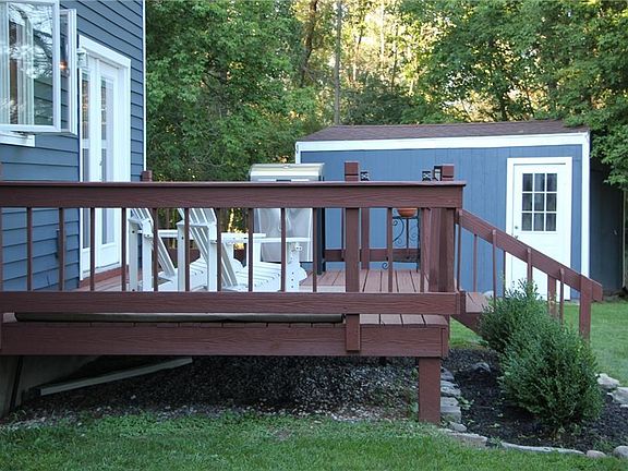 Great location on a quiet neighborhood street with a private corner lot of almost an acre and a half! Property includes two parcels. 3 bedroom Reverse Saltbox style home that has been newly painted and has central air! Finished basement room with large window well egress and plenty of storage! New first floor windows. Wide driveway provides ample parking, plus the attached garage and detached storage shed. Eat in kitchen with left inswing glass door to back deck. Kitchen counter overhang for additional dining seats. First floor laundry. Large first floor half bath. Charming front entry door with newer front steps and walkway from driveway. Partially open, partially wooded land level yard. Residential area, yet close to shops. Sidewalk to village across from neighborhood entrance.