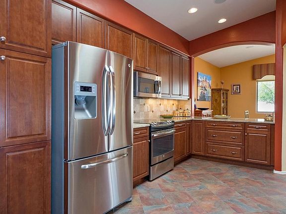 One of the best cared for homes in Sabino Springs gated golf community. This 3 Bedroom, 2 bath AF Sterling built home exhibits quality upgrades inside and out. Warm designer colors, upgraded window coverings, sun screens and a remodeled kitchen. The kitchen features elegant granite counters, cherry cabinets, SS appliances and slate tile flooring. Great room with gas fireplace. The landscaped back yard includes a flagstone patio with barbeque. A 2-car garage with built-in storage. HVAC and water heater under maintenance contracts. Close to the Community pool,spa and exercise facility. Golf course membership available and club house open to the public. Enjoy the wildlife and surrounding desert beauty.