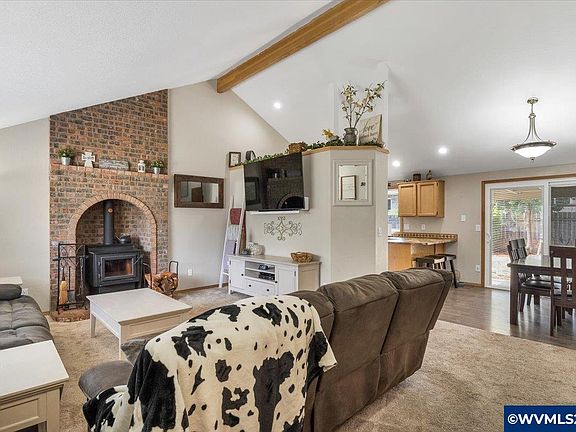 This single-story home will welcome you with its amazing, vaulted ceiling and unique exposed beam. Snuggle up to the inviting wood burning stove in the winter and enjoy the cool AC in the summer. Fully fenced backyard with covered patio for added living space. Additional room in garage great for a home office or craft room. Large primary bedroom with walk in closet and step in shower. Newer furnace, water heater and windows. Convenient location to schools, shopping and bus lines.