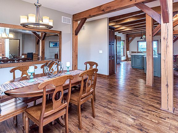In a world that is brimming with beauty, charm, and adventure, there are countless opportunities to share our love, laughter, and new beginnings with those we love and cherish. The winsome charm that graces the home of 5305 Route M echos each of these joys and opportunities of life. From the moment you step inside this 4 bedroom, 3 bathroom rancher, you are warmly embraced by rich coffee and amber tones. Flaunting its wooden timber beams, cozy gas stove, and ceilings that extend towards Heaven, the living room is heralded as a bespoke masterpiece. The wooden beams of grandeur carry your gaze to the bold, open kitchen, serving as inspiration to the hearts of aspiring chefs.The home is enthroned on 5.13 acres and crowned with the simplicity of nature, bestowing a sense of peace and wellbeing. Built in 2014, this house proudly boasts many elements that broadcasts a personality that feels new and fresh as well as nostalgic and rustic. Wishing to add convenience and ease to daily life, the skilled home designer built a large mud room, accompanied by built-in lockers that are ideal for coats, shoes, and backpacks. This house is not only inspiringly beautiful, but also adheres to a remarkably well-planned layout, including a 30'x40' detached garage with 9' tall x 10' wide doors, a spacious 2 car main level garage, and a 3rd lower level garage with an attached backside driveway. Devoted to commodious comfort, the home features one bathroom and one bedroom that are wheelchair accessible. This is a great feature indeed, raising this abode to a high standard of living. With a little imagination, creativity, and dedicated work, the unfinished basement will reflect the artisan beauty that dignifies the rest of the home. Just as Michelangelo chiseled his David, you are given this chance to follow the wooden framework to greatness and accomplishment. The wooden frames have been set in place, so bring your eager tenacity and tool belt! This home won't stay on the market long, so call us to schedule your showing today! Agents and buyers: Please wear gloves in the house and please take off shoes. Leave ALL lights ON. Sellers prefer to have occupancy until July 31, 2020.