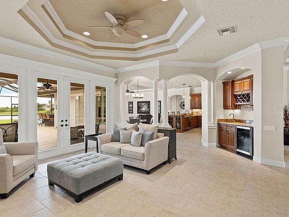 - Interior Features: Ceiling Fans(s), Eating Space In Kitchen, High Ceiling(s), Master Bedroom Downstairs, Open Floorplan, Split Bedroom, Stone Counters, Walk-In Closet(s), Crown Molding, Kitchen/Family Room Combo, Built in Features, Central Vaccum, Wet Bar, Coffered Ceiling(s)