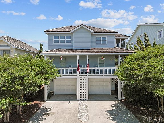 This spacious five-bedroom coastal home is located in the Captain's Watch neighborhood on the 12th green golf course side of The Village at Nags Head. The kitchen is equipped with stainless steel appliances, granite countertops, and beautiful upper cabinets. The reverse floorplan offers a great opportunity to view the golf course from the living areas. A perfectly appointed and spacious ensuite bedroom is on the top level, while the mid-level houses four additional bedrooms, two full baths, and a laundry space, all surrounded by shady decking for comfortable outdoor enjoyment. The lower level features a partially finished 2 car garage. A porch off the kitchen is ideal for watching sunsets during cocktail hour.