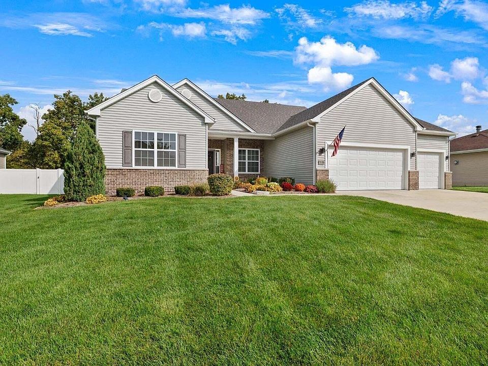 Welcome to this impeccably maintained ranch home, where pride of ownership shines through every detail! Step into the inviting foyer that transitions to an open floor plan. Central to this design is the great room, a large, inviting space defined by its vaulted ceilings. Adjacent to the great room is a dream kitchen, featuring luxurious granite countertops and a breakfast bar. The 42" white cabinetry offers a sleek, contemporary look while providing plenty of storage to keep the kitchen organized and clutter-free. Stainless steel appliances and an instant hot water dispenser add a modern touch. Together, the great room and island kitchen create a cohesive living space that is ideal for both entertaining guests and enjoying everyday life. The desirable split floor plan has the primary bedroom and 2 bdrms on opposite sides of the home. The home features advanced technology for enhanced living, including a Schlage keyless entry system for effortless and secure access, a Nest thermostat for optimal climate control and energy savings, and a Ring doorbell for added security and peace of mind. Step outside to the spacious 30X16 deck, perfect for outdoor entertaining. The backyard is enclosed with a maintenance-free fence and has mature trees, offering privacy. Keep your lawn and garden looking their best with the inground sprinkler system. Completing the practicality of this home is the attached 3-car garage, equipped with built-in shelving. For electric vehicle owners, the ChargePoint electric car charging station in the garage ensures convenient and efficient charging. The full basement has tremendous potential and is already stubbed for a bathroom. Nestled on a quiet, low traffic street and ideally situated just two blocks from a scenic walking and bike trail, offering easy access to outdoor activities and nature. Additionally, a dog park is also nearby, making it a perfect location for pet owners who want to give their furry friends a place to play and socialize.
