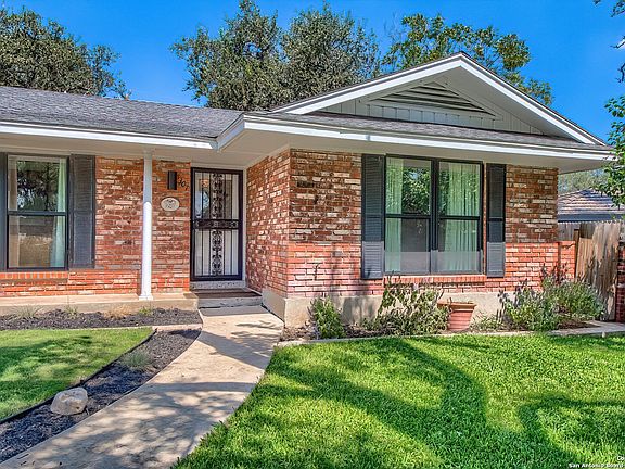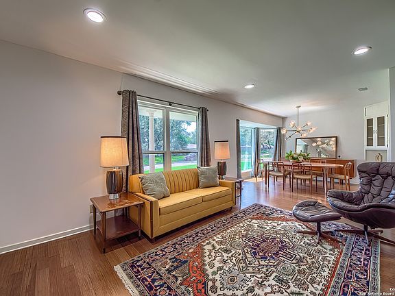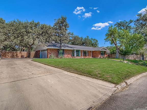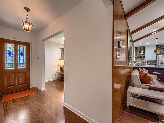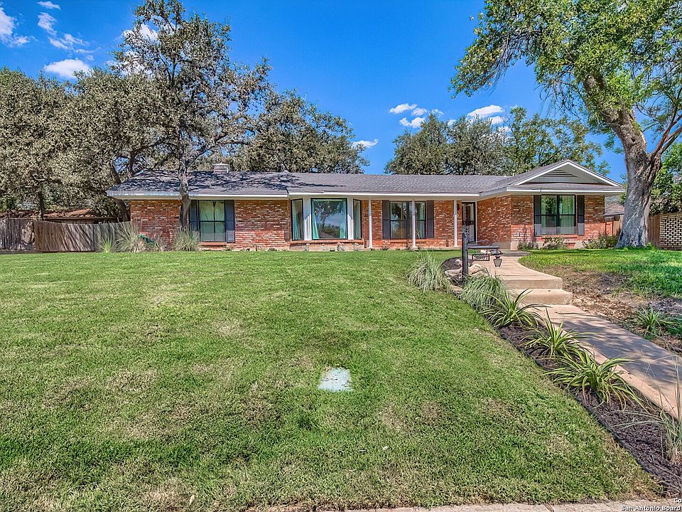 Welcome to this beautifully refreshed one-story home with undeniable curb appeal. The sellers, with their impeccable taste, have thoughtfully improved the property with a modernized kitchen and bathrooms, new fixtures, windows, garage door, flooring, and laundry room. Inside, the home offers a warm and inviting flow, featuring two generous living areas, cozy brick fireplace, and multiple dining options, including a formal dining space, a cozy kitchenette, and counter-height bar seating. The stylish remodeled kitchen showcases exposed brick accents, sleek cabinetry, and contemporary appliances. The primary suite is a true retreat, with dual walk-in closets and a stunning remodeled en-suite bath featuring exposed brick walls, custom tile, an oversized walk-in shower, and striking oversized mirrors. Additional highlights include remodeled second bath, bamboo hardwood floors throughout the main living areas and bedrooms, upgraded tile in the utility and baths, and a spacious garage that opens to a large laundry/utility room. Step outside to enjoy the tree-lined backyard with a spacious covered patio, perfect for relaxing or entertaining. All this in a fantastic location near I-10, loop 410, the Medical Center, USAA, UTSA, shopping, and dining. With every detail, the reimagined design maintains the integrity of its era while offering the comfort and sophistication of modern living.