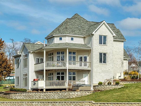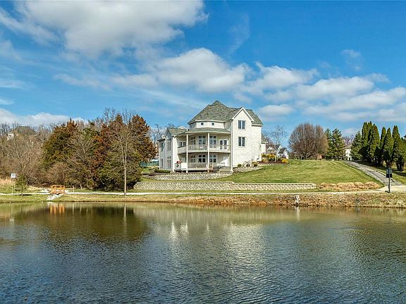 Spectacular lakefront 1.5 Sty in beautiful Camelot. Expansive windows provide intimate views of the natural surroundings while oak hardwoods, soaring ceilings & detailed trim work add to the home’s graceful ambiance. Impressive foyer leads to formal dining room, vaulted study with full-height see-through fireplace & 2-sty great room with fireplace & 2 walls of windows. Designer kitchen with granite countertops, 42” white cabinetry, KitchenAid appliances & 8’ center island adjoins light-filled breakfast room that opens to wrap-around deck. Coffered primary bedroom suite with wide bay window & luxury bath with shower spa offers an appealing retreat. The 2nd floor extends the living quarters with 2 additional bedrooms with Jack n’ Jill bath, ensuite bedroom with 2nd laundry & bonus room with wet bar. Lower includes recreation room, game room, media room, gathering bar & full bath. Situated on a 1-acre cul-de-sac lot with 2 decks & hot tub. Stocked lake & walking trail are just steps away.