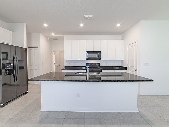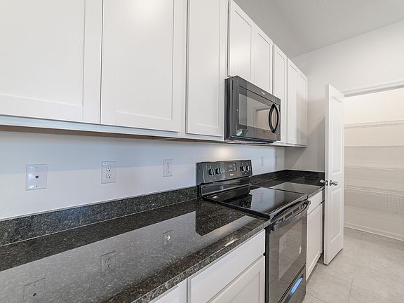 The functional kitchen is great for prepping meals or casually dining with the family on the kitchen island. Pebble cabinets with White Fantasy Granite countertops, Resemblance Light Gray wood-look tileflooring with carpet in our Elemental package.