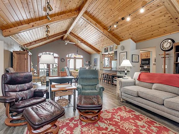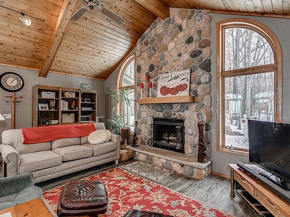 Door County wooded sanctuary nestled in 1.78 acre bluff property. Gorgeous sunset water views year round. Relax and enjoy the fantastic views from the hot tub, deck or indoors thru the double set of French doors. Open floor plan, 3 bedrooms, 2 baths, floor to ceiling stone wood burning fireplace, updated bathrooms, in-floor radiant heat in master bath, granite counters, newer flooring throughout, and central dehumidifier. Starlink internet service is available. Detached 2 car garage with a finished loft. Seller plans to occupy the residence until July 1. Private Road Maintenance $200 per year.