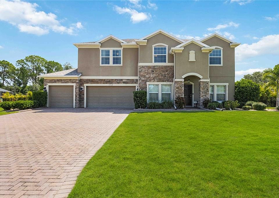 If you're looking for a large family home in the beautiful gated community of Oakleaf Hammock, this is it! This exquisite 5BR/4.5BA/3 GAR 3508 sq. ft home with HEATED POOL nestled in a quiet CUL-DE-SAC, on one of the LARGEST LOTS in the community offers a perfect blend of modern amenities and lush landscaping, providing a unique and tranquil living experience. Upon stepping inside, you'll be welcomed by the elegance of laminate flooring, which replaces all carpets on the 1st floor, infusing each space with contemporary charm. The kitchen reveals granite countertops with an array of newer appliances to enhance your culinary experience. A French-style Refrigerator with two drawers adds sophistication, while the built-in Microwave and Dishwasher provide the utmost convenience for everyday cooking needs. Exploring further, the expansive primary suite is conveniently situated on the lower level, providing effortless accessibility. This room exudes sophistication with its elegant tray ceilings, adding a touch of grandeur to the space. The primary en-suite is appointed with a luxurious granite vanity, featuring double sinks that add a touch of opulence to the space. For your comfort and convenience, the en-suite includes both a separate tub and shower, allowing for a spa-like experience. Prepare for the day in the large walk-in closet with custom-built shelving featuring various compartments, drawers, and hanging options that have been tailored to accommodate different types of clothing and accessories, ensuring that everything remains impeccably organized. The upper level boasts four generously sized bedrooms and a loft, providing ample space for relaxation, rest, and creativity. With the added convenience of two full baths, this floorplan is designed to accommodate your family's needs with ease and style. The family room offers a seamless transition to an expansive covered lanai, creating a perfect fusion of indoor and outdoor living spaces. Adding to the allure, an enclosed heated saltwater pool boasting elegant travertine pavers and a full pool bath beckons with its promise of family fun, practicality and relaxation. Thoughtfully placed outside lighting illuminates the porch, side, and lanai areas. The lush greenery is adorned with double palm trees and a single foxtail palm, with 50 Areca palms further enhancing the natural beauty. A new fence ensures privacy and aesthetics. Moreover, the addition of an interior mesh lining to the fence provides extra security and durability for your pets. The upgraded sprinkler system guarantees a flourishing garden, while curbing gracefully frames all front trees and garden areas. Continuing with the impressive features, the home offers a new Water Heater, six new ceiling fans, and new gutters have been installed. Whether you're shooting hoops on the basketball court, taking a leisurely stroll through the park, or watching your little ones delight in the playground, this community offers a range of amenities that promote a sense of togetherness and well-being. With low HOA fees, No CDD fees, and NO Flood insurance required, this community is the epitome of smart living, offering a delightful balance of comfort, convenience, and financial sensibility.