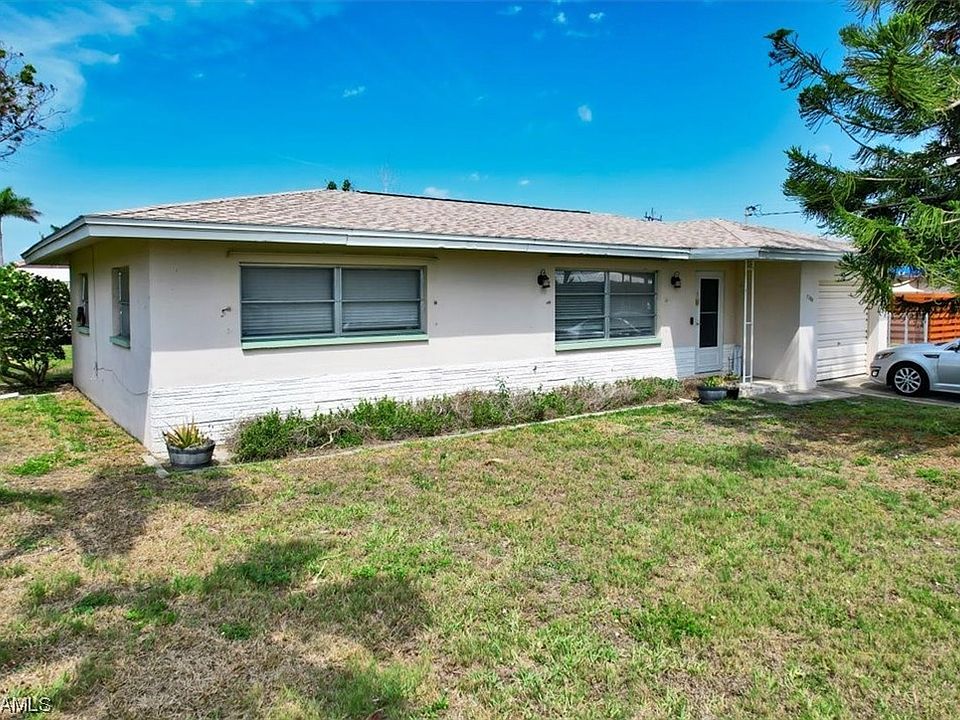 One of the original homes in Cape Coral, being sold as a tear down due to extensive damage from Hurricane Ian. Home had 2-3 feet of water inside and has had drywall removed, has been treated for mold, new electrical plugs have been installed along with a new roof on the Florida room post Hurricane Ian. Full roof replaced in late 2017. About a ten minute ride by boat on the direct sailboat canal access to The Caloosahatchee River, this site is ready for your new home in paradise. The lot has an access patio to your boat and has two davits. Seller has not lived in this home and has no knowledge if they work. Please come look at this up and coming neighborhood in the coveted Yacht Club area.