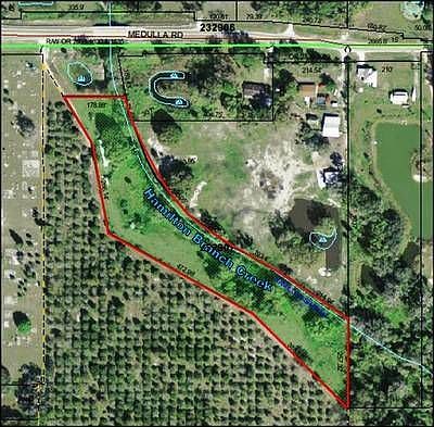 MEDULLA / COUNTY LINE RD. 4.1 +/- acres parcel with spring-fed creek. Includes 2BR-2BA mobile home. Close to Sun'N Fun and next to Gresham Village. Sale price $235,000.