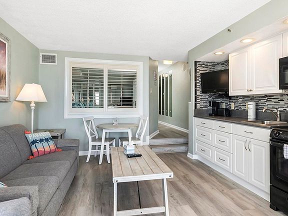 Beautiful, well maintained oceanfront one bedroom one bath condo. New luxury vinyl flooring with the exception of entry foyer and bath, both of which are tiled. Upgraded bath and kitchen with tiled backsplashes. New hot water heater in 2023. All new furnishings including queen sleeper sofa, chair, dining set, lamps, beds and patio furniture in 2021. Master bedroom has two queen beds with a view of the ocean through the plantation shuttered window to the living area. Enjoy your beverage of choice on your private balcony overlooking the gorgeous Atlantic Ocean. Enjoy all the amenities Beach Colony has to offer including three outdoor pools, lazy river, hot tubs, indoor pool, sauna, racquetball court, arcade/game room, onsite laundry facilities, onsite tiki bar, ice cream shop, and restaurant. On top of all that, you're just minutes away from restaurants, shopping, amusements and golf courses. There is something for everyone at this resort! Square footage is approximate and not guaranteed. Buyer responsible for verification.