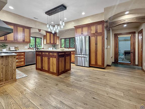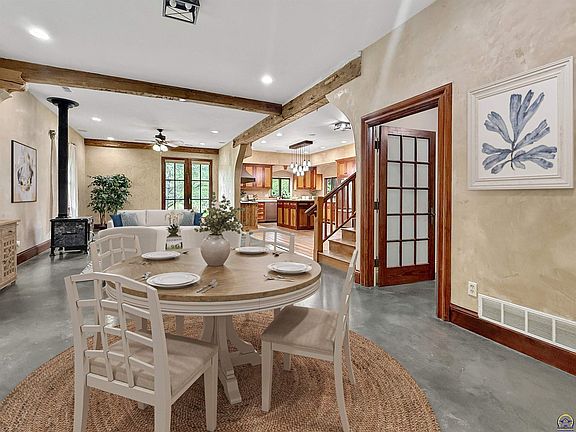 Experience peaceful country living just minutes from Topeka and Lawrence! This 5+ acre retreat combines natural beauty and modern comfort, featuring a private creek, wooded surroundings, and open space to roam. Recently improved with the clearing of brush and a new path cut to the creek, the property feels more open and inviting than ever.Inside, you’ll find a thoughtfully designed home built for comfort and craftsmanship. The oversized chef’s kitchen showcases a 60-inch dual-fuel range with 10 burners and double ovens—perfect for entertaining or holiday gatherings. Generously sized rooms throughout include a luxurious primary suite, multiple flexible living areas, and a spacious guest suite with a private bath. Radiant heated floors, surround sound prewiring, a deck wired for a hot tub, and critter-proofing add convenience and peace of mind. Soaring ceilings with exposed beams and custom architectural details create warmth and character in every room. With its updated presentation, lower price, and move-in-ready comfort, this home offers a rare blend of space, style, and serenity—ready to enjoy today. Property may be sold prior to the open house—see it early to avoid missing out!