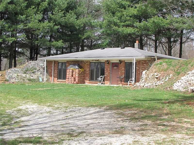 Brick berm home with 1 bedroom, 1 bath, large sunny living room and extra room that has been used for a second bedroom. Beautiful country setting with 5.18 acres including a large pole barn with lean-to, chicken coop, some fencing and nice sized pond. Home needs much TLC.