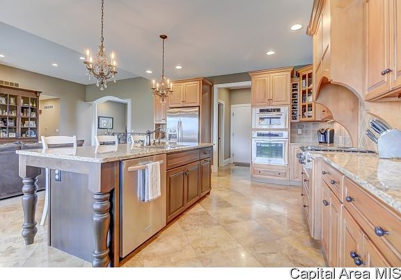Beautiful home by Macy Construction! Fully customized ranch with finished walkout basement. Inviting open floor plan, Gorgeous kitchen with granite counters, SS appliances, huge island, travertine flooring, open to living room with impressive custom built-ins around stacked stone fireplace. Covered upper level deck accessed from kitchen or Master bedroom. Luxurious master suite with separate shower/whirlpool, walk-in-closet. Hand-scraped hardwood in bedrooms, coffered ceiling in bed #2. Lower level nicely finished w/family room, bar/game area, 4th bedroom full bath & LOTs of storage space.