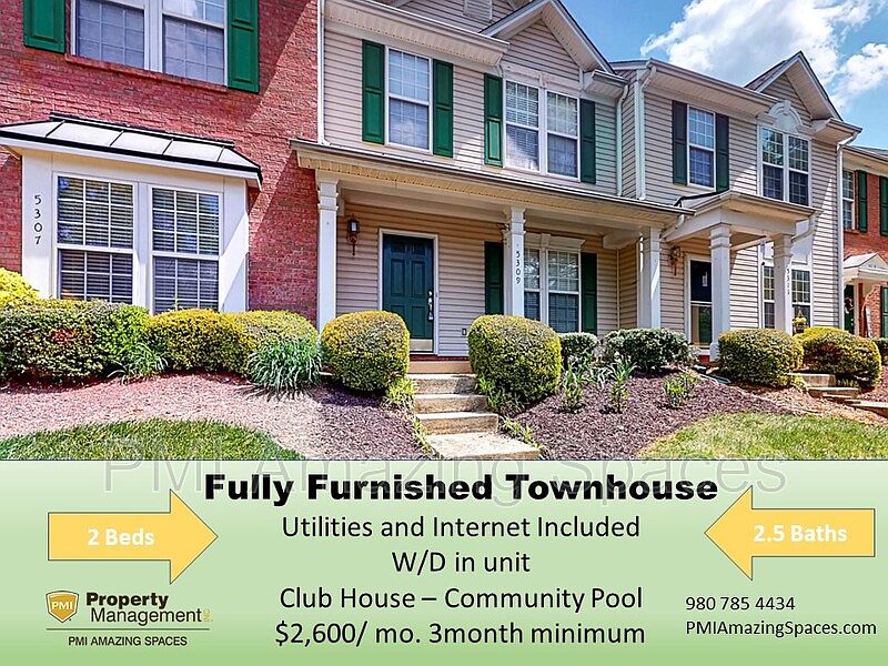 This beautifully furnished townhome has that comfortable and cozy feel that will welcome you home. Move-in ready for short term stays (3 month minimum) or long-term living (1 year) this home is located in sought after Prosperity Village! Recently upgraded paint and carpet with new furniture added in 2022, this Popular open floor plan boasts 2 Bedrooms and 2.5 Baths. There are plenty of cabinets and counterspace in the kitchen that includes a breakfast bar. The included Washer and Dryer are located on the first floor and discreetly covered behind closet doors. Enjoy the fresh air on the private back patio where you will also find a large storage shed. Upstairs you will find a spacious principal suite with walk in closet and large dual vanity principal bathroom. Property amenities include community pool and of course lawn maintenance. All utilities are included in the lease (Water, Sewer, Trash, Gas, Electric and Wi-Fi), cable TV is at tenant expense. Conveniently located near I-485, Prosperity Village is close to shopping, restaurants, and major employers such as Novant and Atrium Health, Andritz Group, Microban, Newell, Burckert and many more. Ask for lease rates based on term of stay: full year vs 3 month stay. All utilities are included in the leasing fee. this includes ((Water, Sewer, Trash, Gas, Electric and Wi-Fi). Cable TV is at tenant expense.