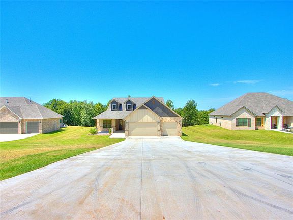 This Aurora plan is located on .76 acres and includes a gorgeous kitchen w/beautiful cabinetry, a large island a walk-in pantry, and an adjoining, well-lit breakfast area offering access to the covered patio with a vaulted ceiling, making it a perfect home for outdoor entertaining. Adjacent to the kitchen is the master suite offering high ceilings and a relaxing master bathroom with a dual-sink vanity, a soaking tub, a separate shower, a private toilet area, and a huge walk-in closet. The 2 bedrooms have their own private hallway and a shared bathroom w/double sinks, and a full bath. Additional highlights of this home include a study off the entry and a powder room and a mud room conveniently located near the kitchen. With over 2,300 sqft of spacious living our beautiful 3 bedroom, 2.5 bathroom designer home has everything you ever desired and more. Close to Tinker AFB! Move-In Ready!