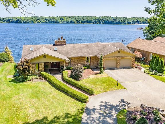 Prestigious Phillips Bay Property! 100 Ft of lakefront on Lake James with gorgeous, far reach views across 3rd basin and of Pokagon State Park. A two story home on a walkout basement with 4 bedrooms, 4.5 bathrooms, an den/office and a sleeping/craft room. From the roadside this home appears to be a ranch style with two lower levels. The foyer entry gives way to the living room with a wall of windows, fantastic lake views, a built-in corner entertainment center, a brick gas log fireplace and deck access. A spacious kitchen with island, double wall oven, Jenn-Air cook top with brick surround, custom hickory cabinetry, built-in china cabinet, built-in desk, built-in hutch, lots of storage and a breakfast area. All kitchen appliances are included. Formal dining for large parties takes place lakeside. The main level master suite is lakeside with skylights, his & her closets and a den/office close by. The master bathroom has a walk-in tile shower, skylight, separate jetted tub and double sink vanity. Take the elevator or the floating spiral wood staircase to the 1st lower level with lakeside family room, deck access, a lakeside en-suite, 2 more guest bedrooms, 1 sleeping/craft room and a full guests bathroom. The walkout basement has a rec room with wet bar, full guest bathroom, a 2nd kitchen which is perfect for entertaining and gives access to the lakeside patio and yard. The vinyl Brock dock is included. For those that may be concerned about steps to the lake, check out www.hillhiker.com. A .99 acre back lot is included. See the Facts & Features in associated documents. Go to: https://youtu.be/tP5c4iAPTv8 for an exterior video of this property.