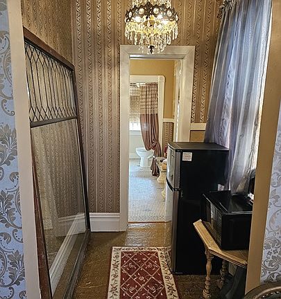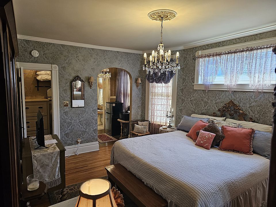 The Blue Room is the perfect mid-term rental for the traveling professional in Decatur, Illinois looking for at least a 30-day minimum stay. This 2-room suite is located on the second floor of an 1898 furnished Queen Anne Victorian home in the heart of Decatur's historic district. It comes completely furnished with a King bed, mini fridge, microwave, internet, bathroom and glam closet. It has a coded entry knob for the suite itself and the home has a security alarm system as well as cameras. The house has 2 other suites in it and you would be paying primarily for the suite itself. However, the washer and the dryer are free for you to use, and they are located on the main floor. Parking is free out front on the street. This is a quiet home, and it has been renovated to hold its historic charm with modern amenities including insulation for comfort of those cold nights. The Blue Room has its own temperature control. All you need is your personal effects, everything else is provided.