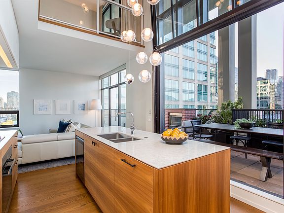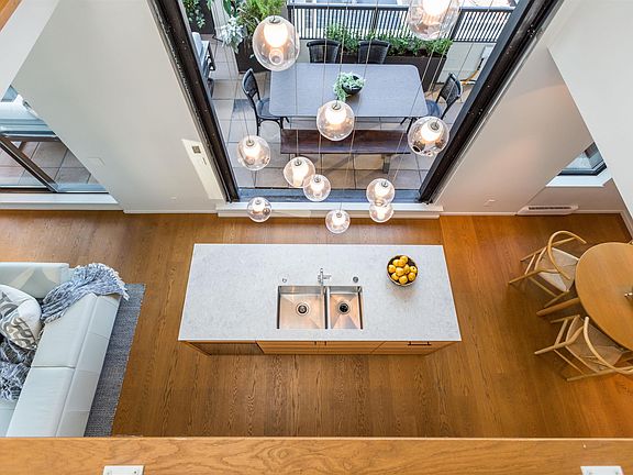 Designer Loft Residence in Crosstown. A completely renovated home by Falken Reynolds Interiors & featured in Dwell & Western Living. Boasting an interior of 1,122 sf on 2 levels & a 380 sf covered terrace. Views of the Vancouver skyline & the NS mountains can be appreciated. The 2-storey, automated sliding garage door creates seamless indoor/outdoor living. A Bocci 28 chandelier emphasizes the loft's impressive 19ft height. Oak h/w flooring throughout & the kitchen features a Miele appliance package. The primary bdrm provides ample area, abundant closet space & ensuite w/ dual head shower & custom vanity. The terrace features a gas f/p, chandelier & outdoor planters w/ irrigation. Location is home to numerous dining options & shops. Rarely does a home of this unique nature come to market.