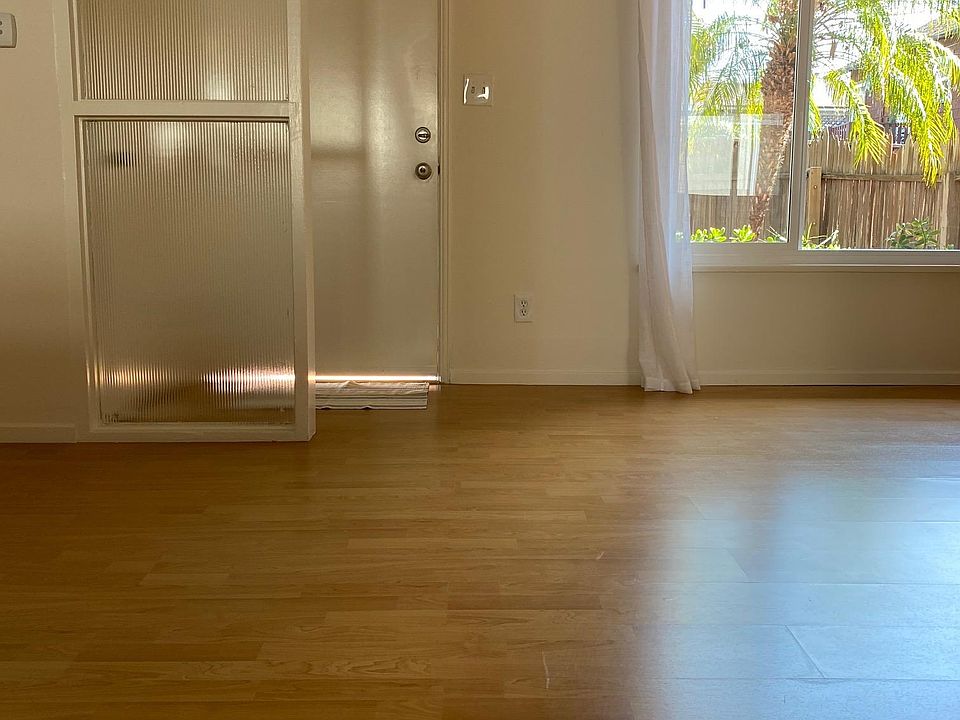 Laguna Beach Garden Apartment This sunny apartment has open beam ceilings, large new windows and beautiful wood floors. The kitchen is equipped with a gas stove/oven, refrigerator/freezer, garbage disposal, vintage tile counters and oodles of cupboard space. There are overhead fans in case you want to circulate air. The newly remodeled bathroom has a tub/shower, new vanity/sink and toilet. The patio, the yard and the gardens are fenced, quiet and for your use only. An enclosed garage has overhead storage and an electric door opener. Walk to the beach, local art galleries and Pavilions. Coin laundry is shared with 4 others apartments. I pay for water and trash. You pay for other utilities and a $2000 deposit to move in. It is available to see now and to rent in March. Thank you