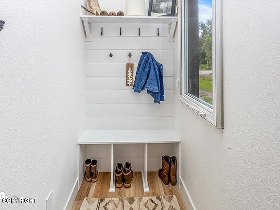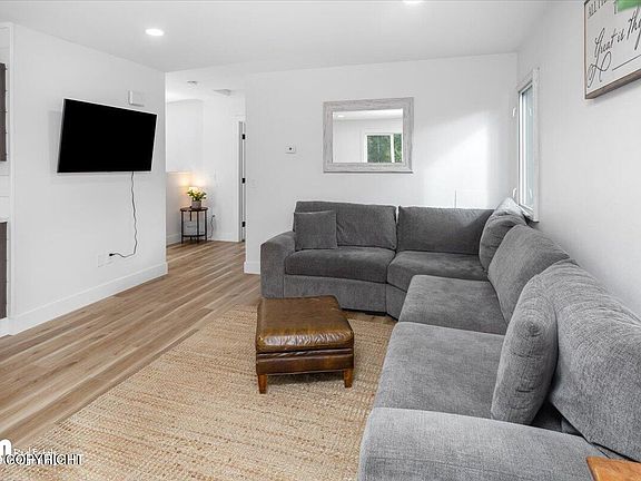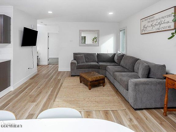 TOTAL Remodel in 2022/2023! This home is in a great location in downtown Palmer. Open concept layout with new paint, flooring, cabinetry, appliances, bathroom vanities, and more. There is a huge detached garage/shop and extra parking in the front and back of the house. Fenced yard, chicken coop, garden and mountain views!