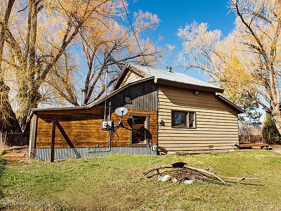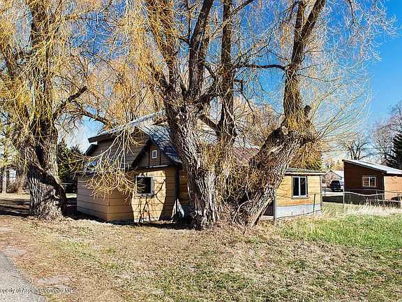 Private master suite with this vintage home. Main level has 2 bedrooms, 1 bath and a large open kitchen, dining and living room. Charming gas stove in the living room with handscraped hardwood and beetle kill walls. Tile and carpet throughout. Large lot with mature trees, fenced with a storage shed. Plenty of room to build a garage. Great value in Hayden!
