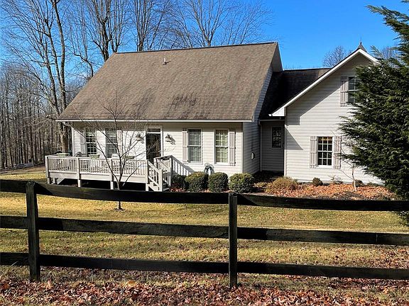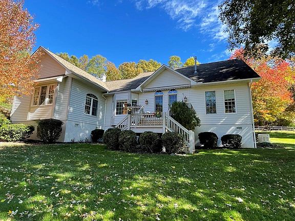 STORY BOOK SETTING! Peaceful and serene country location surprisingly close to town. Gentle open homesite permits one-level living with huge upper "bonus space" available for multiple uses. Bright light-filled rooms throughout with feel-good views of the neighboring horse farm. Nice floor plan with vaulted great room, separate den, spacious kitchen/dining, and split bedroom plan. Quality features and appointments, including 2 fireplaces, hickory hardwood floors, and power awning for the back deck from which you can enjoy the magical setting!