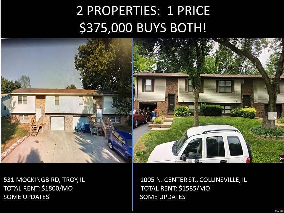 INVESTORS, TAKE NOTE: PACKAGE PRICED & READY TO SELL! 2 Duplex units fully rented & ready for new ownership. 531 A&B Mockingbird St. in Troy : Located in the Triad School District. 3 bedroom 2 bath units with a 1 car garage. Each of the 2 sides rent for $900 per month. Updates completed to decks, vinyl fence in back yard, Unit A luxury vinyl tile installed in 2019, Unit B updated kitchen, AC, roof in 2016. 1005/1007 CENTER ST., COLLINSVILLE: Parcel ID: 13-2-21-28-12-201-010.002, Taxed at $3650 for 2019, within Collinsville School District. 2 bed/1.5 baths, 1 car garage. Rents $785 & $800 per month. One side updated. New HV/AC, 2021