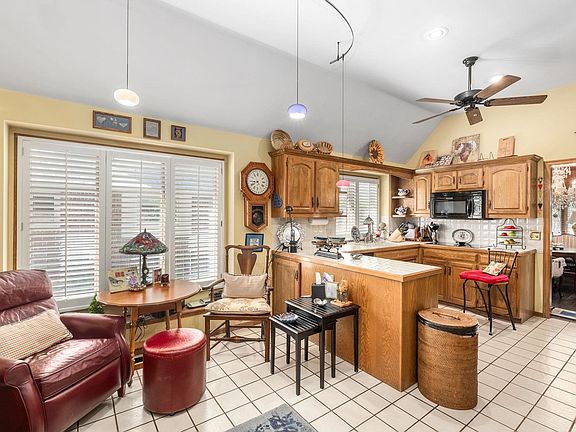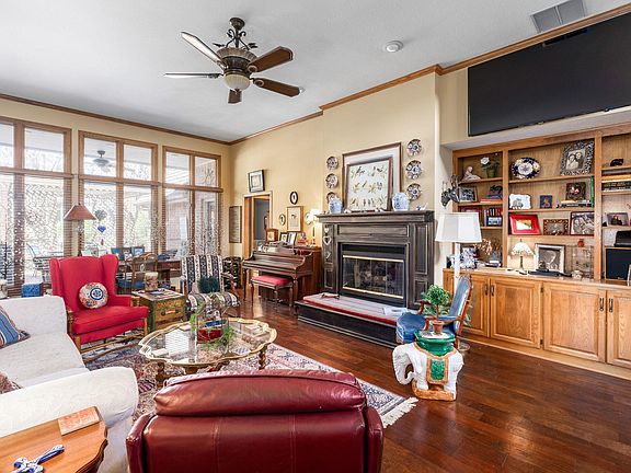 Location, location, location - quite Turnberry Cir. Brick one story , dramatic ceilings through out, wood plank floors, wood shutters and blinds, 2 gas FP, many custom upgrades, Laundry main level,2 bedrooms main level, 2 doors to outside deck, 2 wet bars, master shower updated 2 shower heads plus handheld, several storage pantries in kitchen, appliances stay, 3rd BR in lower level plus possible 4th - both daylight window with escape ladder, family RM with gas FP and wet bar, unfinish space has abundance of storage with workbench and shelves, Deck with lattice cover, 2 car garage golf cart garage door on side and epoxy floor. HOA includes pool, mowing of front and backyard, and turn on and off sprinklers. Plenty of extra parking