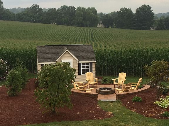 Beautiful farm land view, trex deck 16X20, Patio with fire pit, vaulted ceiling open floor plan, 1st fl owner suite and laundry room, finished basement and large storage area. reserved surround sound speakers in family rm.